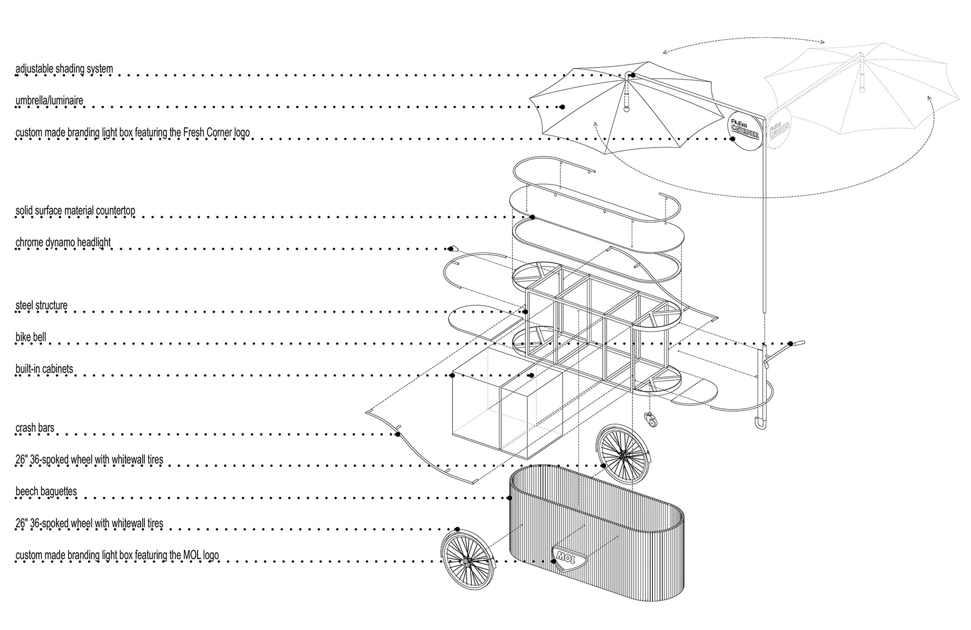 The design concept is taken from street food culture and from design elements of the two bike wheels, suggesting freedom of movement, accessibility and freshness . The bar is composed of two elements: a pill shaped bar and a steering mechanism. The bar is built around a steel structure enveloped in beech baguettes and covered with a solid surface material countertop. It is fitted with built-in cabinets, all-around crash bars that also serve as handgrips for the built-in cabinets, functional two 26" 36-spoked wheels with whitewall tires, one functional chrome dynamo headlight and one custom-made branding lightbox featuring the MOL logo.
